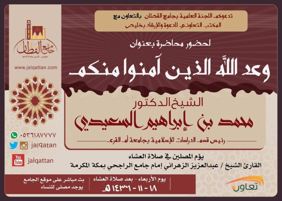 تستضيف اللجنة العلمية بجامع القطان وبالتعاون مع المكتب التعاوني للدعوة والإرشاد بخليص ، فضيلة الشيخ د.محمد السعيدي في محاضرة بعنوان ” وعد الله الذين آمنوا منكم ” ، وذلك يوم الأربعاء الموافق ١٨-١١-١٤٣٦هــ عقب صلاة العشاء .