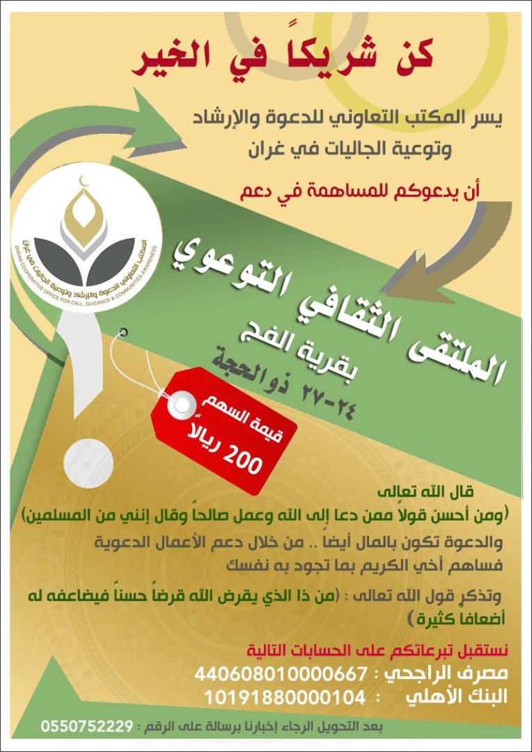 فتحت شعار “كن شريكاً في الخير” دعا المكتب محبي الخير والراغبين في الأجر إلي المساهمة في دعم الأعمال الدعوية من خلال دعم الملتقى الثقافي التوعوي الذي سوف يقيمه المكتب إبتداءً من ٢٤ ذي الحجة ١٤٣٦ هـ لمدة ثلاثة أيام بقرية الفج ، والذي سوف يشتمل على العديد من المحاضرات لعدد من المشائخ والدعاة وطلبة العلم ، بالإضافة إلى عدد من البرامج الموجهة للرجال والنساء والشباب والفتيات والأطفال.
