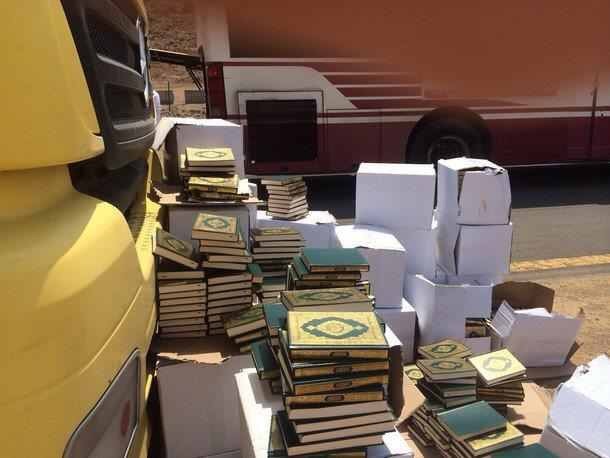 وتحفظت الأجهزة الأمنية بمحافظة الجموم ، بالتنسيق مع فرع وزارة الشؤون الإسلامية بمنطقة مكة المكرمة، على الشاحنة التي كانت محملة بنحو 30 ألف نسخة من المصاحف ، وذلك لاتخاذ الإجراءات النظامية بشأنها.