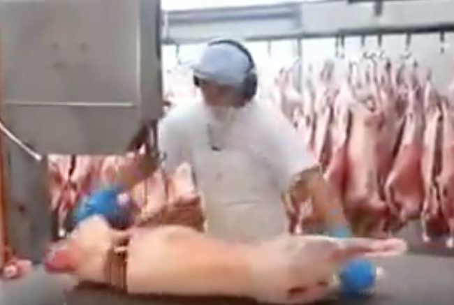 ويعرض مقطع الفيديو كيف يمكن تقطيع لحوم الخراف كاملة في ثوان معدودة باستخدام آلة كهربائية ينحدر منها شفرات حادة تقطع الحيوان بمجرد تمريره من أسفلها .