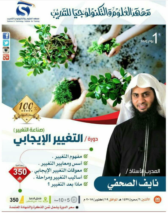 يعقد معهد العلوم والتكنولوجيا للتدريب دورتين في “تطوير الذات” يلقيهما الداعية المعروف الشيخ “نايف الصحفي” ، الأولى بعنوان “التغيير الإيجابي” يوم الإثنين ٦ محرم ، والثانية بعنوان إدارة الذات يوم الثلاثاء ٧ محرم بمدينة جدة.