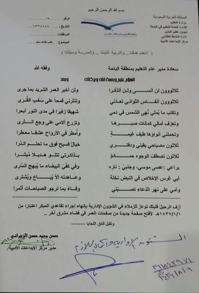 قدم مدير مركز الإبداعات الأدبية ، المعلم حسن الزهراني ، طلب تقاعده المبكر من تعليم الباحة ، عبر أبيات شعرية أرسلها للمدير العام لتعليم الباحة.