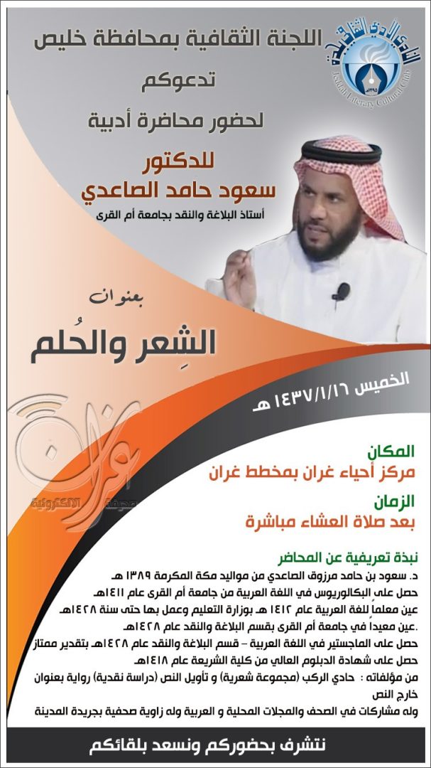 تفتتح اللجنة الثقافية بمحافظة خليص التابعة للنادي الأدبي الثقافي بجدة موسمها الأدبي لهذا العام بمحاضرة للدكتور سعود حامد مرزوق الصاعدي أستاذ البلاغة والنقد بجامعة أم القرى بعنوان “الشعر والحلم” يوم الخميس ١٦/ ١ / ١٤٣٧هـ في تمام الساعة الثامنة مساء بمقر مركز أحياء غران بمخطط غران.