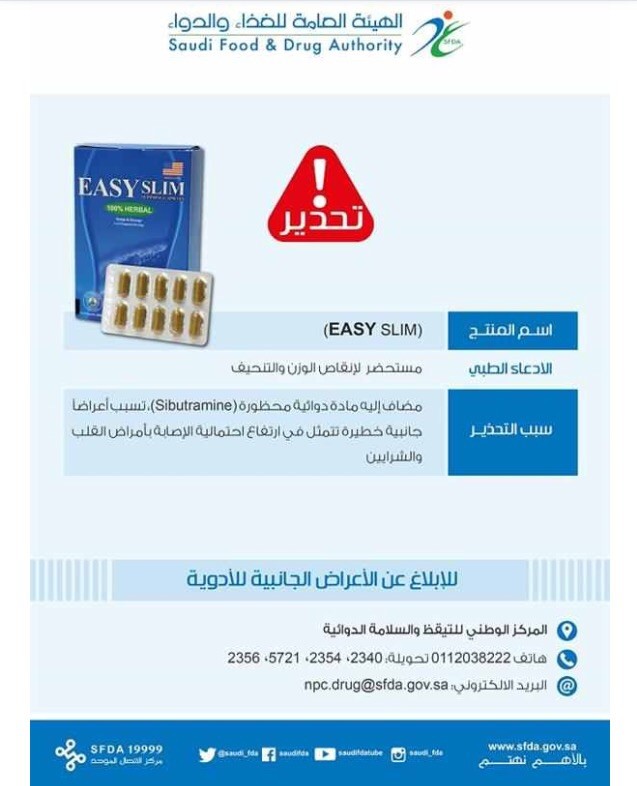 وأوضحت في بيان على موقعها الإلكتروني (www.sfda.gov.sa) أن التحاليل التي تمت في مختبرات الهيئة أظهرت إضافة مادة السيبوترامين (Sibutramine) للمستحضر وهي مادة دوائية محظورة لعدم ضمان مأمونيتها وخطرها على الصحة ووجود أعراض جانبية خطيرة لها تتمثل في إرتفاع احتمالية الإصابة بأمراض القلب والشرايين.