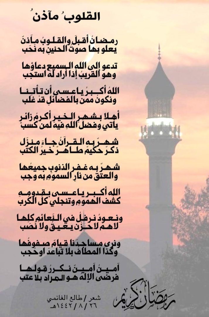 صحيفة غراس الالكترونية > شعر وشعراء > القلوب مآذن القلوب مآذن الشاعر: كلمات : طالع الغانمي - أداء : عبدالواحد المغربي 12 أبريل, 2021م 1 1239 القلوب مآذن كلمات الشاعر : طالع الغانمي أداء : الشيخ عبد الواحد المغربي