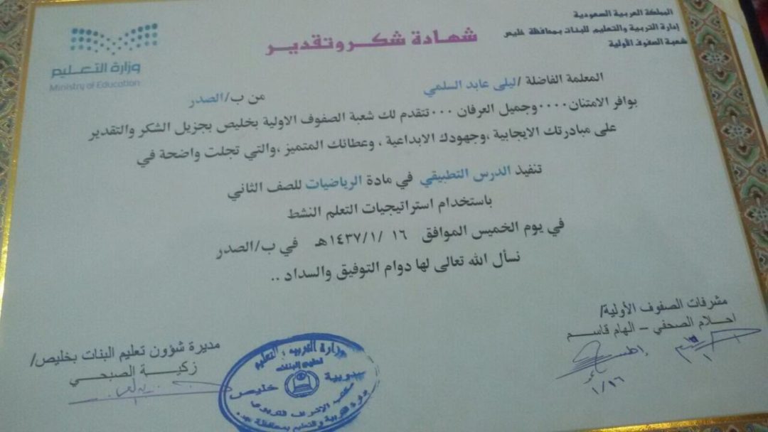 هنـيئًا للتعليـم عمومًا ولمدرسـة ابتدائية الصـدر خصوصًا بالمربـية الناجحـة والمبدعـة دومًا الأستاذة ليـلى بـن عابــد السـلمي ..