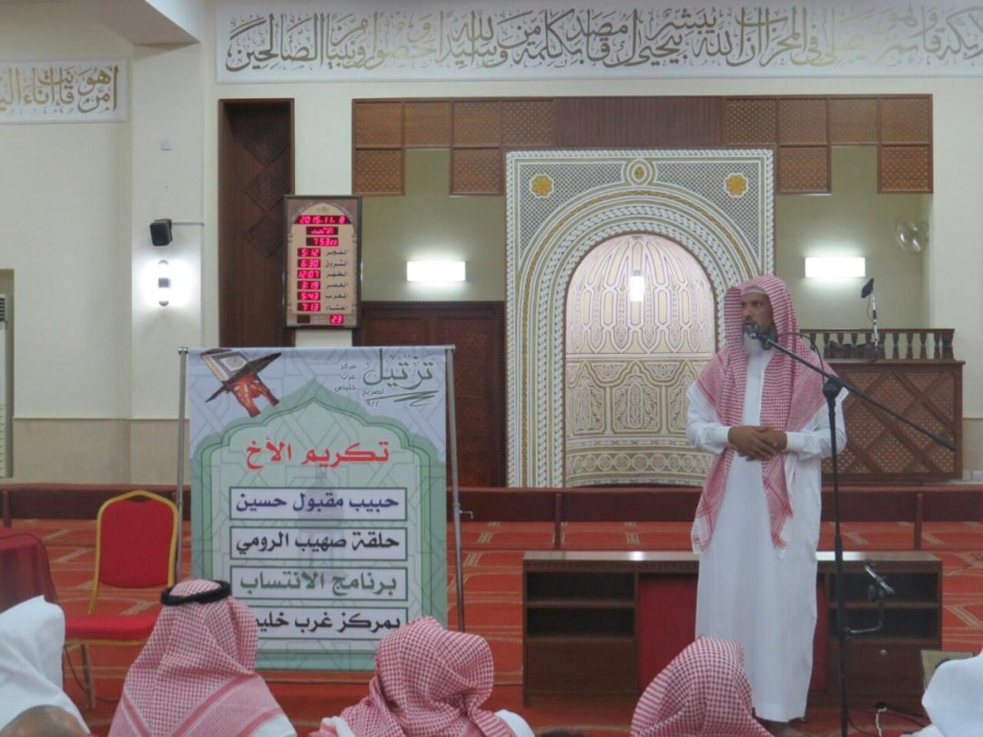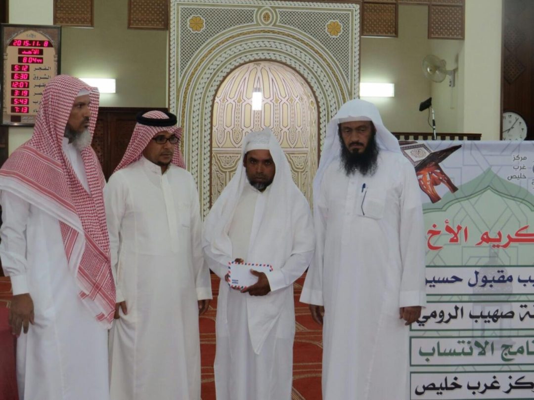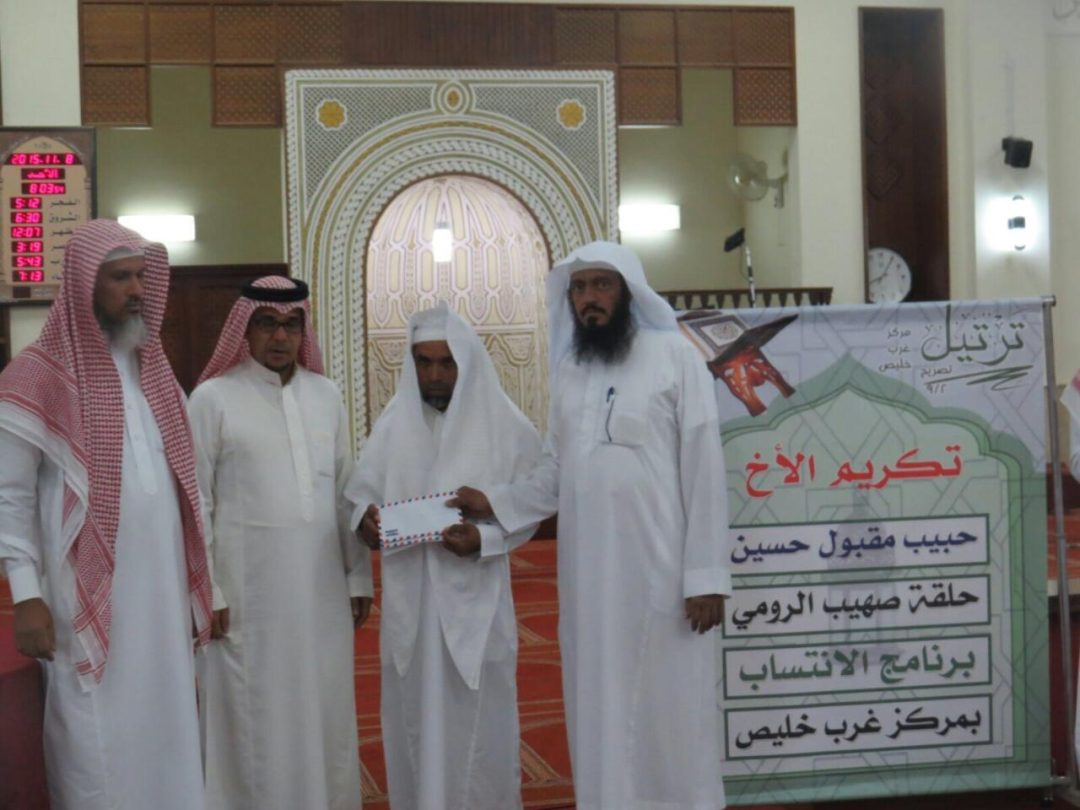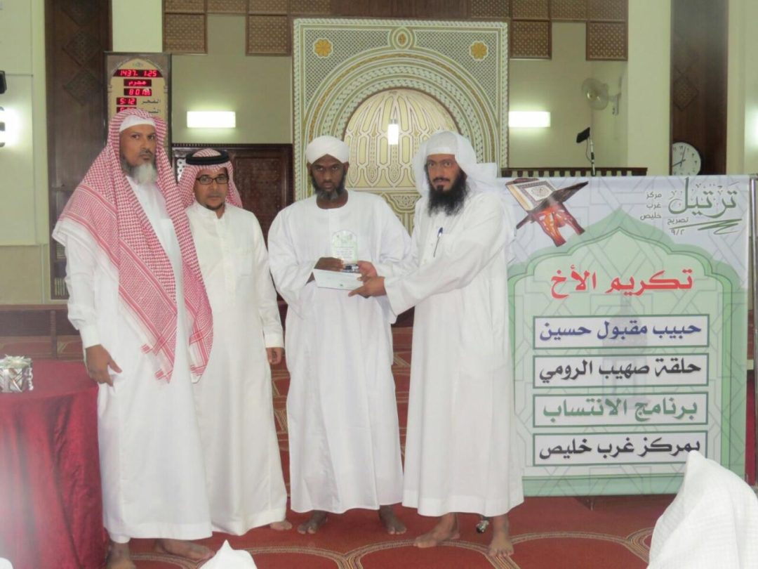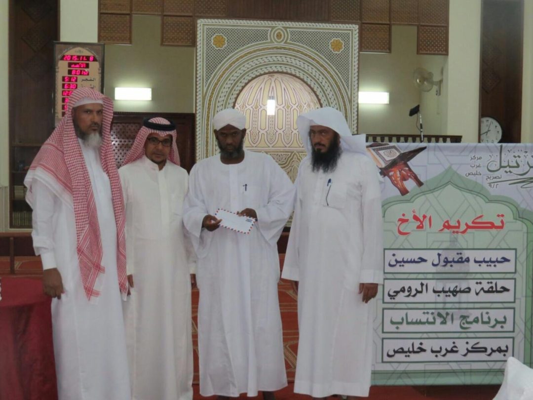 بحضور مدير الجمعية الخيرية لتحفيظ القرآن الكريم “ترتيل” اﻷستاذ عبدالرحيم عبدالعليم الصحفي ، ومدير مركز غرب خليص لتحفيظ القرآن الكريم اﻷستاذ فيصل نافع الصبحي ، ومندوب مستشفى خليص اﻷستاذ فواز رحيم المغربي وفي حفل تكريمي بجامع الجفالي ، قام مركز الغرب بتكريم الحافظ رقم 20 بالمركز وذلك ضمن برنامج “الإنتساب” وهو الحافظ اﻷخ “حبيب مقبول حسين” من الجنسية البنغلادشية ، وكذلك تم تكريم معلم الحلقة الشيخ “أحمد حامد” .