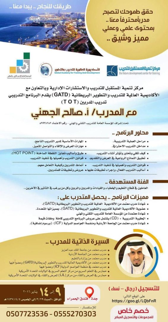 تحت إشراف المؤوسسة العامة للتدريب التقني والمهني يقدم المدرب الأستاذ صالح الجهني دورة “تدريب المدربين TOT” في ٩ يناير القادم لمدة أسبوع بفندق الحمراء بجدة. وتستهدف الدورة العاملين في قطاع التعليم والخطباء والقيادات والمدربين وكل من يرغب في التأثير على الآخرين.