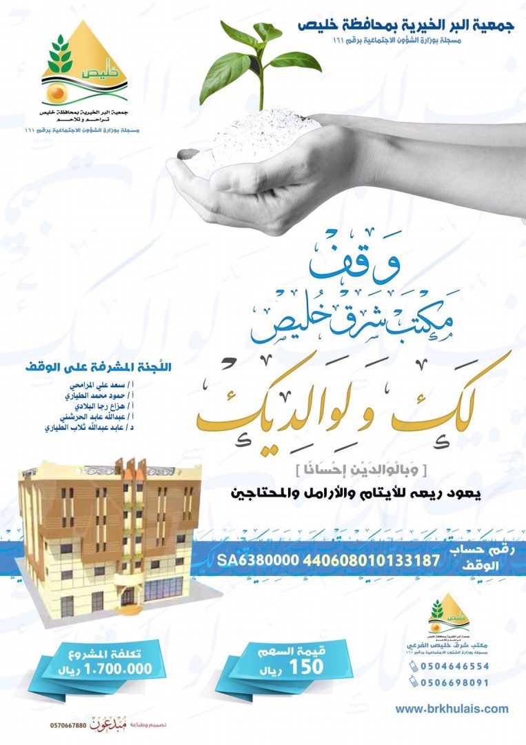 وجهت جمعية البر الخيرية بمحافظة خليص الدعوة للمساهمة في وقف مكتب شرق خليص الفرعي “لك ولوالديك” ، حيث يبلغ تكلفة المشروع 1.700.000 ريال ، والذي يعود ريعه للأيتام والأرامل والمحتاجين ، ويشرف على الوقف لجنة مكونة من عدد من الأساتذة الكرام وهم :
