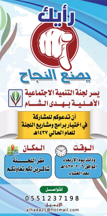 عقدت لجنة التنمية الإجتماعية الأهلية بهدى الشام مساء الأربعاء ١٤٣٧/٢/٦ هـ لقاءً مفتوحاً مع الأهالي للمشاركة في اختيار برامج ومشاريع اللجنة للعام الحالي ١٤٣٧ هـ ، وقد حظي اللقاء بحضور ممتاز ومشاركات فعالة من قبل الحضور في اقتراح البرامج والمشاريع التي تهدف إلى خدمة المجتمع وتطويره ، حيث قدمت اللجنة في بداية الإجتماع عرضاً مرئياً للبرامج والمشاريع التي تم تنفيذها ، بعد ذلك فُتح المجال للعصف الذهني وطرح الإقتراحات ومناقشتها.
