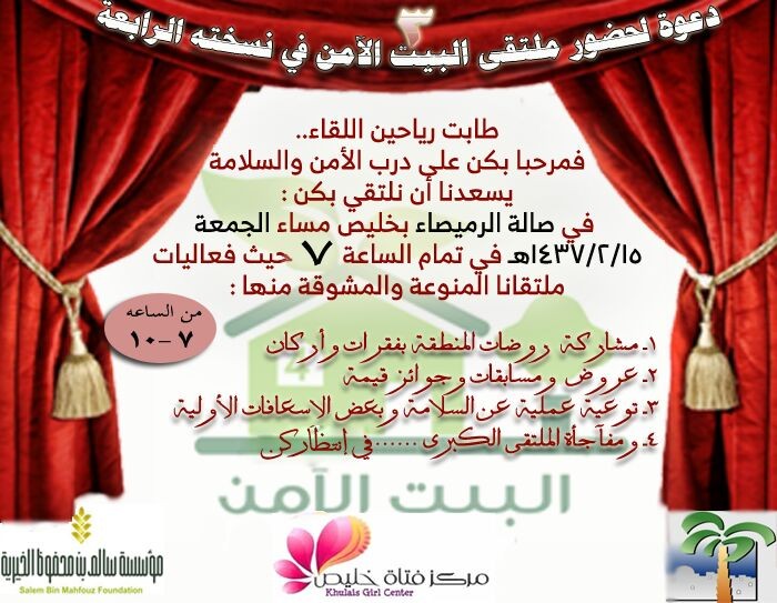 نشاط غير مسبوق واستعدادات مكثفة بدأت منذ فترة في أروقة مركز فتاة خليص ، وذلك استعداداً لتنظيم الملتقى التوعوي الثالث للبيت الآمن في نسخته الرابعة والمقرر إقامته بـ”صالة الرميصاء” بخليص ، والذي تنطلق فعالياته مساء الجمعة 1437/2/15 هـ .