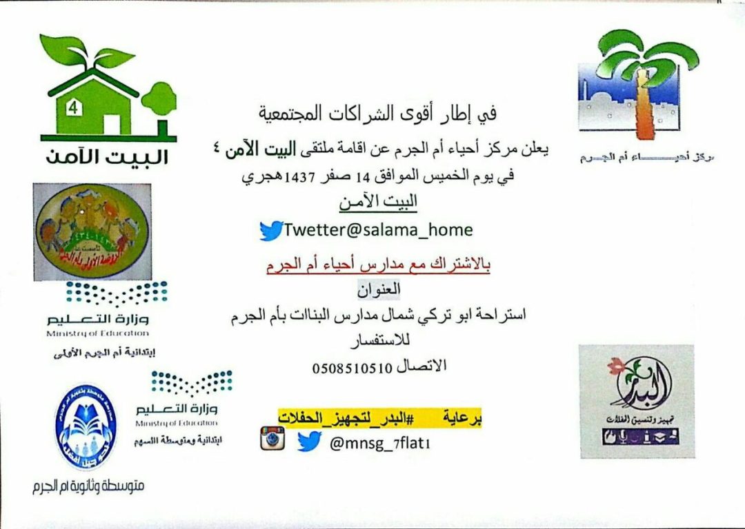 وقد وجهت اللجنة بطاقات الدعوة لسيدات أحياء أم الجرم لحضور الفعالية والإستفادة مما سيطرح فيها حول ثقافة الأمن المنزلي ، والمقرر إقامته بـ”استراحة أبو تركي” الواقعة شمال مدارس البنات بأم الجرم ، والذي تنطلق فعالياته مساء الخميس 1437/2/14 هـ ، كما أنها عقدت شراكات قوية مع وزارة التعليم ممثلة في مدرسة ابتدائية أم الجرم ، و ابتدائية ومتوسطة السهم ، و متوسطة وثانوية أم الجرم للبنات .
