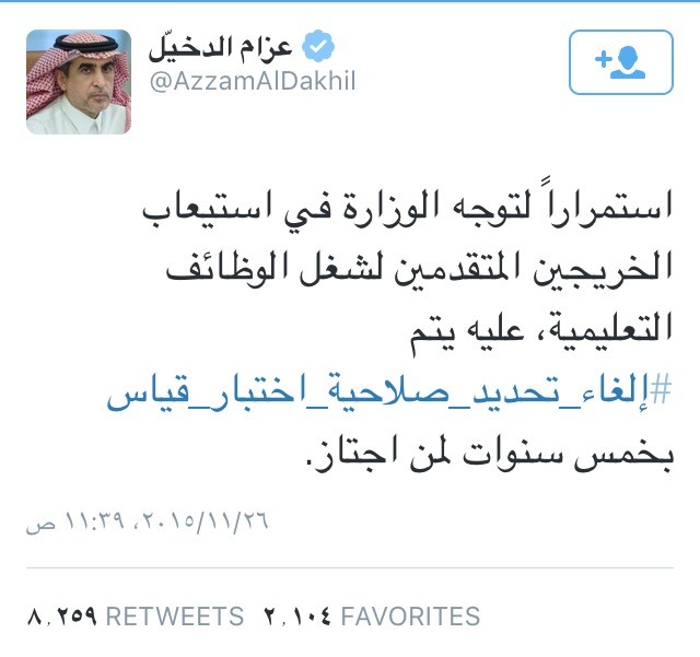 صحيفة غراس الإلكترونية > التربية والتعليم > “التعليم” تلغي صلاحية “قياس” للمتقدمين للوظائف التعليمية “التعليم” تلغي صلاحية “قياس” للمتقدمين للوظائف التعليمية الكاتب: متابعات ورصد 26 نوفمبر, 2015م 0 5932 أعلن وزير التعليم الدكتور عزام الدخيل عبر حسابه الشخصي على موقع التواصل الإجتماعي “تويتر” ، إلغاء تحديد صلاحية اختبار “قياس” بـ 5سنوات لمن اجتاز ، وذلك لاستيعاب الخريجين المتقدمين لشغل الوظائف التعليمية .