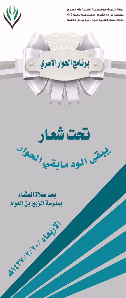 تقيم لجنة التنمية الإجتماعية الأهلية بأم الجرم وتحت إشراف مركز التنمية الإجتماعية بوادي فاطمة برنامجاً للحوار الأسري وتحت شعار “يبقى الود مابقي الحوار“ ، والذي يهدف إلى نشر المفاهيم الثقافية والإجتماعية للحوار الأسري ، وإبراز أهمية الحوار الأسري ، ودوره في مواجهة الإنحرافات السلوكية والفكرية و تعزيز الحوار والتواصل بين الوالدين وأبنائهم ، وذلك يوم الأربعاء الموافق ١٤٣٧/٢/٢٠هـ عقب صلاة العشاء بمدرسة الزبير بن العوام .