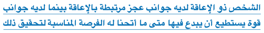 الشخص السليم لديه جوانب عجز وكذلك المعاق لديه جوانب عجز مرتبطة بالإعاقة ولكن المشكلة تكمن في تسليط الضوء على جوانب العجز لدى المعاق وتجاهلها لدى الشخص السليم ولو تعاملنا بذات المنظور لاستطعنا إدراك جوانب القوة لدى الشخص المعاق واستغلالها الاستغلال الأمثل وتحييد جوانب العجز لديه وبهذه الآلية نستطيع أن نجعل منهم أشخاص منتجين ومساهمين في التنمية الاجتماعية أُسوةً بالأشخاص السليمين وربما أكثر فالمشكلة في الحقيقة مشكلة متعلقة بثقافة المجتمع وليس بالشخص المعاق .