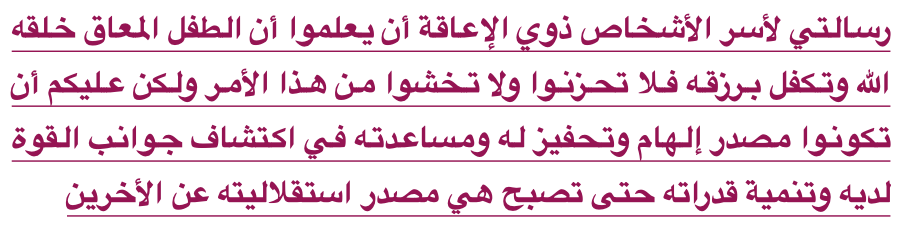 رسالتي الثالثة لأسر الأشخاص ذوي الإعاقة وهي اعلموا بأن الطفل المعاق خلقه الله وتكفل برزقه فلا تحزنوا ولا تخشوا من هذا الأمر ولكن عليكم أن تكونوا مصدر إلهام وتحفيز لهذا الطفل ومساعدته في اكتشاف جوانب القوة لديه وتنميتها واستغلالها الاستغلال الأمثل لهذه القدرات حتى تصبح هي مصدر استقلاليته عن الأخرين .