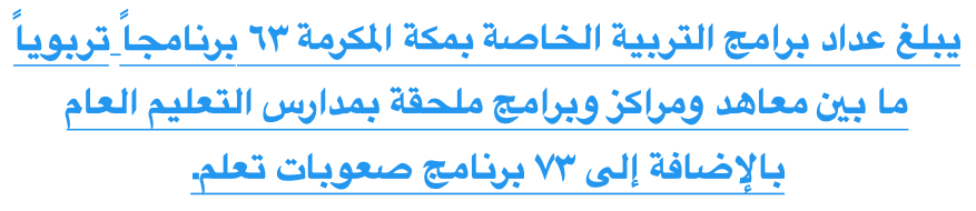 يبلغ عداد برامج التربية الخاصة بمكة المكرمة ( ثلاثة وستون ) برنامجاً تربوياً ما بين معاهد ومراكز وبرامج ملحقة بمدارس التعليم العام بالإضافة إلى ( ثلاثة وسبعين ) برنامج صعوبات تعلم.