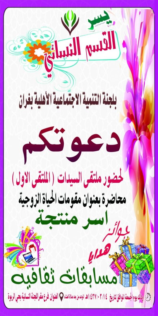 ينظم القسم النسائي بلجنة التنمية الاجتماعية الأهلية بغران ملتقى السيدات الأول بحي الربوة مساء الجمعة الموافق ١٤ربيع الأول لعام ١٤٣٧هجري ، وذلك عقب صلاة العشاء مباشرة ، وسوف يشتمل الملتقى على محاضرة بعنوان “مقومات الحياة الزوجية” بالإضافة إلى معرض لمنتجات “الأسر المنتجة” وعدد من المسابقات الترفيهية والجوائز القيمة.