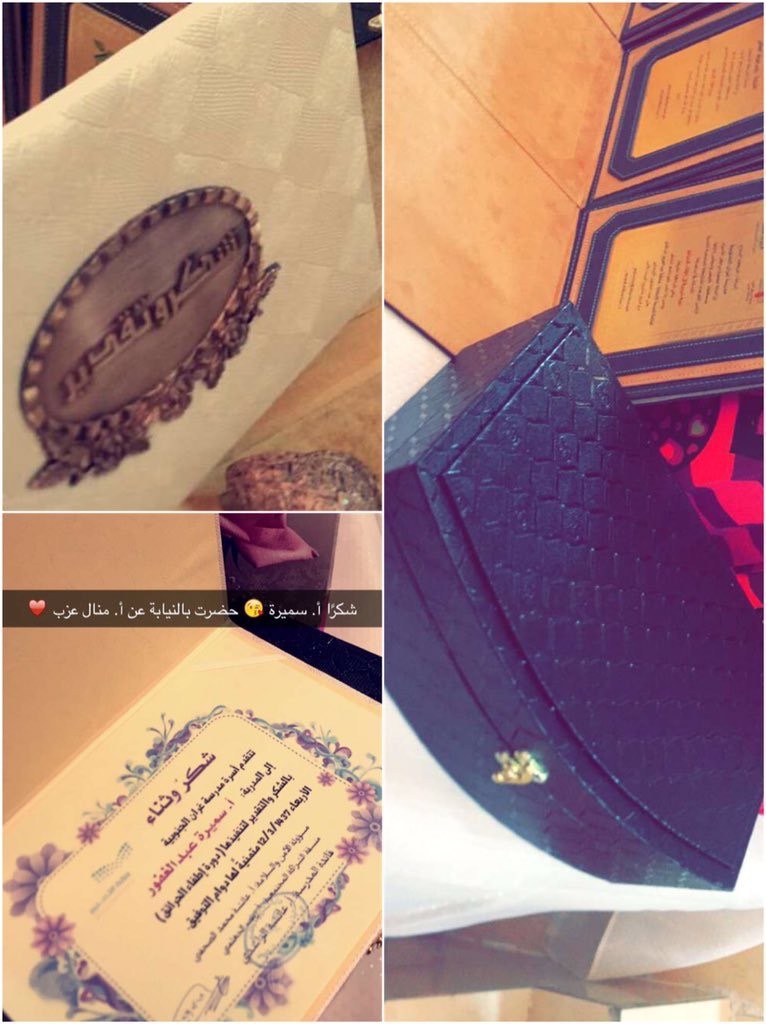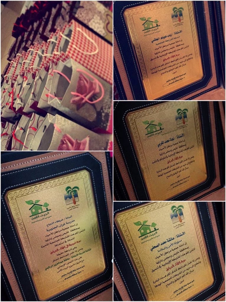 ومن جانبها كرّمت جمعية مراكز الأحياء شركاء النجاح (مدرسة غران الجنوبية) وقائدتها الأستاذة عائشة الراشدي ، كما كرّمت مسؤولة الأمن والسلامة الأستاذة عائشة الصحفي ، ومنظمة الاستقبال الأستاذة نجاة المغربي ، وكذلك منسقة الشراكة المجتمعية الأستاذة زينب الجغثمي ، بدروع تذكارية خاصة .