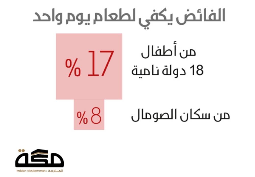 بلغ عدد الأطفال الجائعين في 18 دولة نامية بأفريقيا وآسيا وأمريكا اللاتينية 4.8 ملايين طفل ، يمكن لفائض طعام مكة المكرمة للعام الماضي سد جوع 17% من أطفال تلك الدول ليوم واحد، بحسب المدير العام لمشروع وقف حفظ النعمة والسقاية والإطعام الخيري في مكة المكرمة أحمد المطرفي.