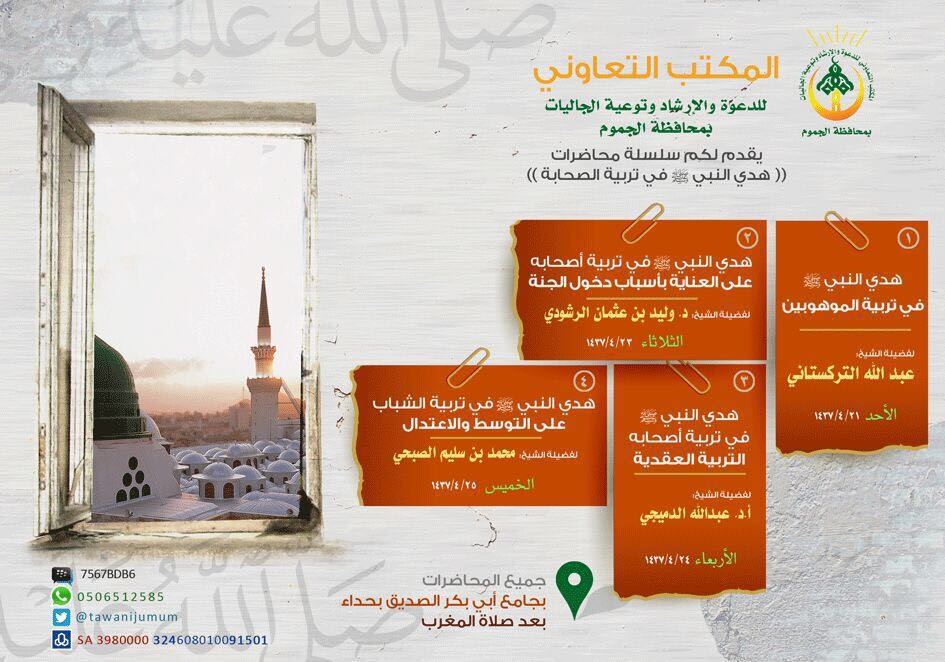 أعلن المكتب التعاوني للدعوة والإرشاد وتوعية الجاليات بمحافظة الجموم عن إقامة سلسلة محاضرات بعنوان “هدي النبي صلى الله عليه وسلم في تربية الصحابة” ، حيث سيشمل البرنامج إقامة 4 محاضرات بجامع أبي بكر الصديق بحداء عقب صلاة المغرب ، وجاءت المحاضرات على النحو التالي :