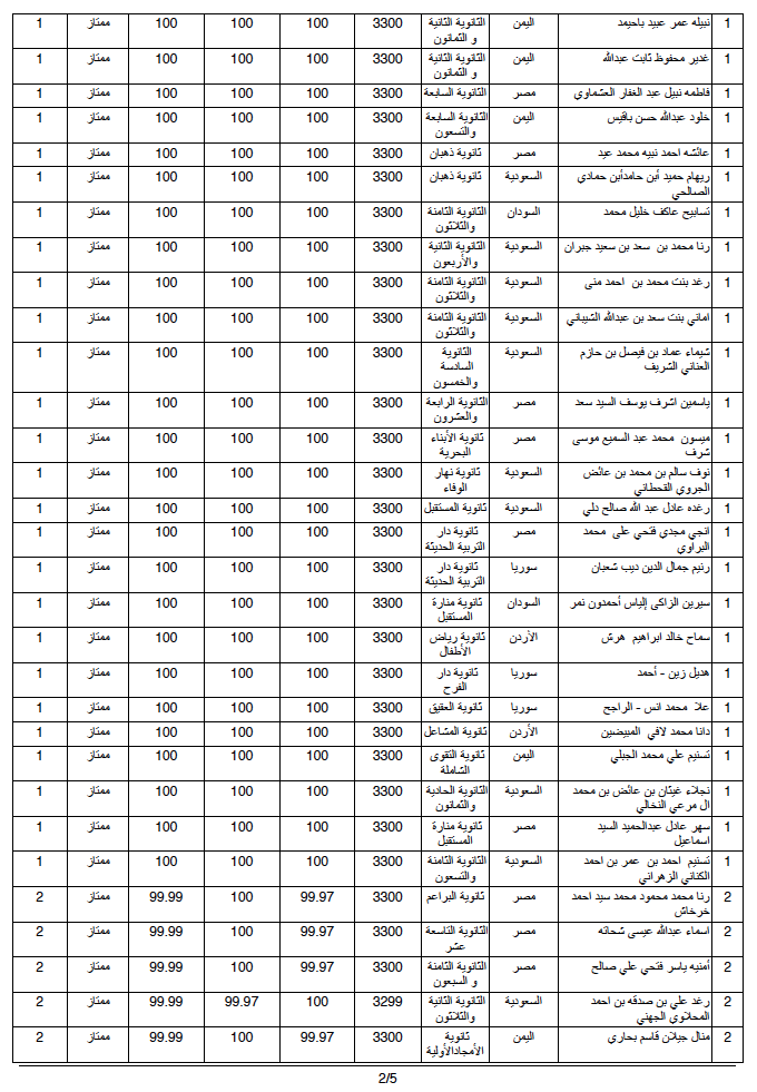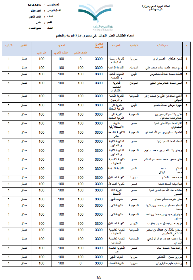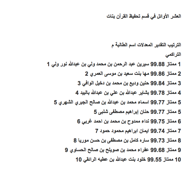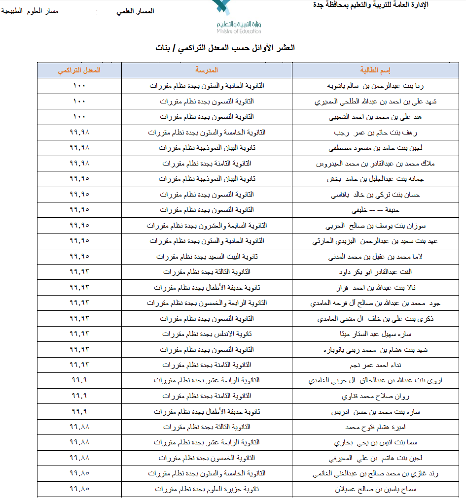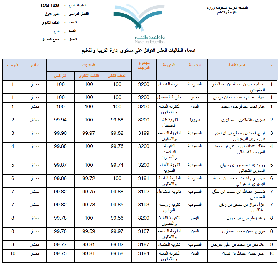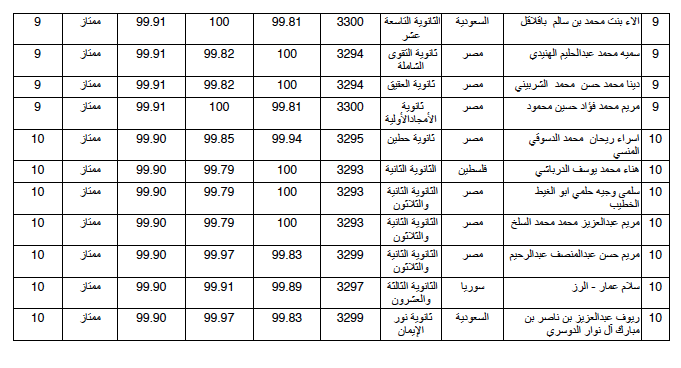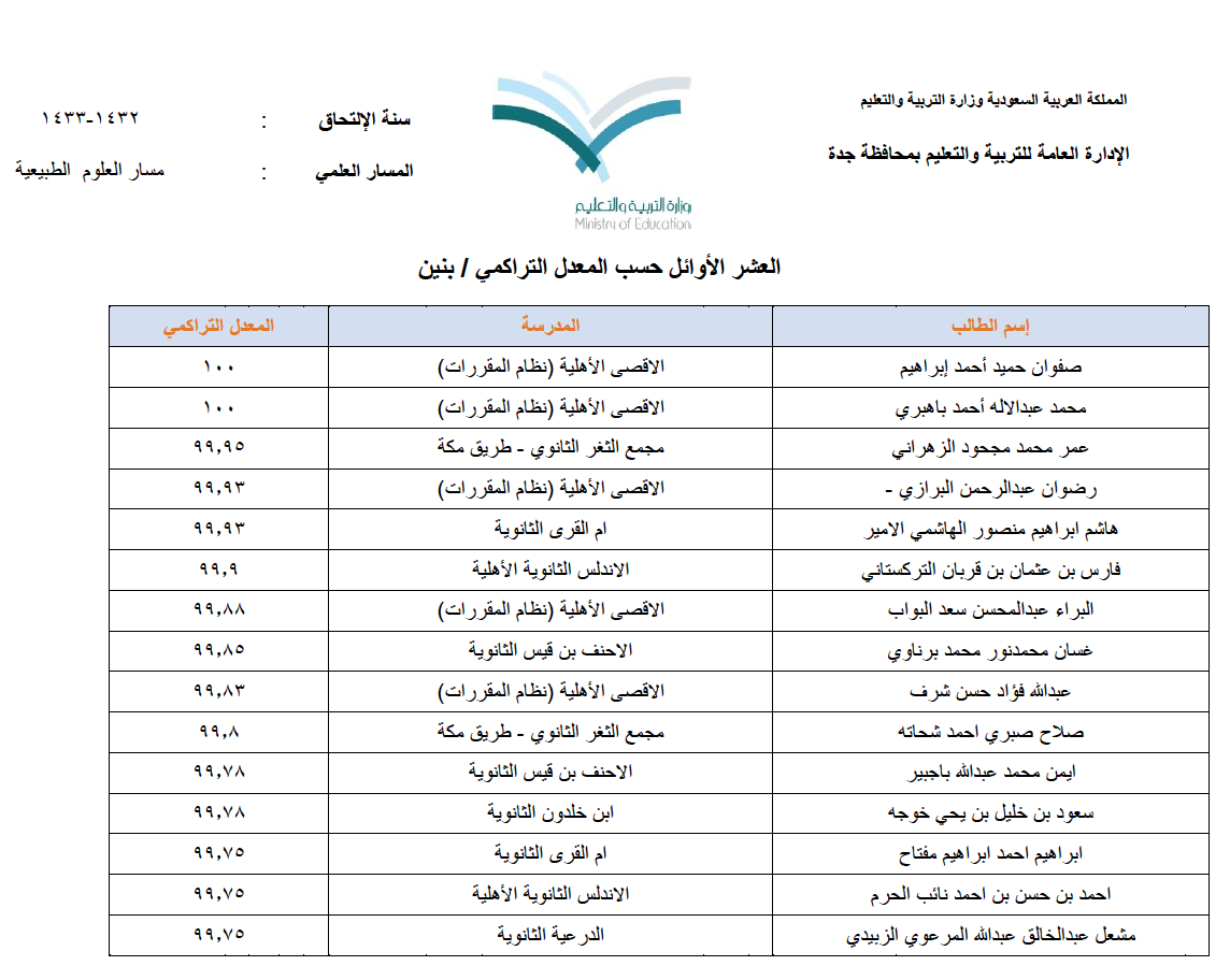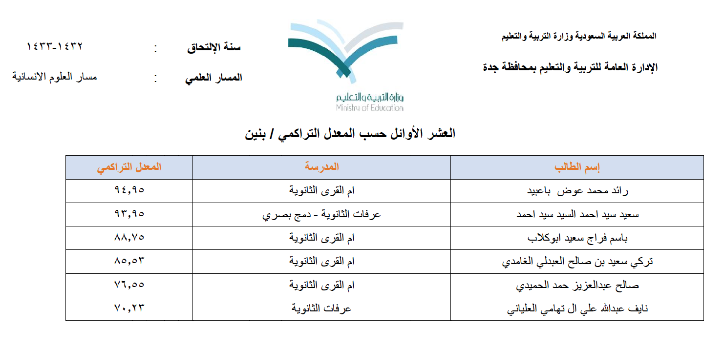 صحيفة غراس الإلكترونية > أهم الأخبار > إعلان أسماء العشرة الأوائل (بنين وبنات) على مستوى محافظة جدة إعلان أسماء العشرة الأوائل (بنين وبنات) على مستوى محافظة جدة الكاتب: بوابة جدة التربوية 11 يونيو, 2014م 8 82361 أعلنت الإدارة العامة للتربية والتعليم بمحافظة جدة أسماء الطلاب والطالبات الأوائل في امتحان الثانوية للعام الدراسي ١٤٣٤/١٤٣٥ هـ وفيما يلي قوائم الأسماء : البنات قسم تحفيظ القرآن الكريم ق