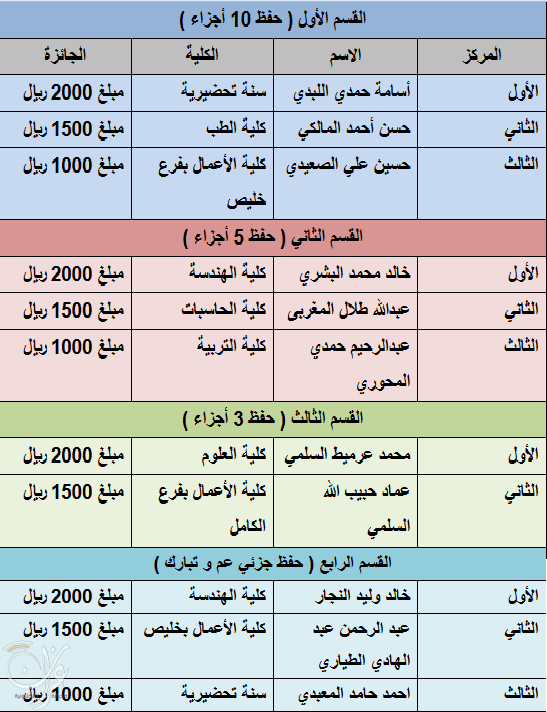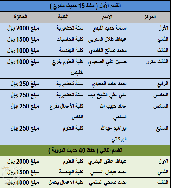 1- المركز الأول : عبدالله عاتق البشري ( كلية العلوم – المكافأة 2000 ريال ) .
