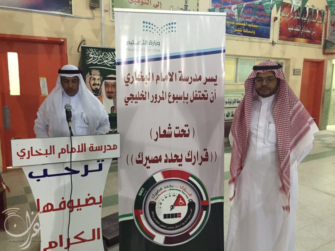 و من جهة أخرى ، و في إطار الاحتفال بأسبوع المرور الخليجي لعام ١٤٣٧ هـ و تحت شعار “قرارك يحدد مصيرك” ، أقام النشاط الطلابي بمدرسة الإمام البخاري و بمتابعة قائد المدرسة الأستاذ شرف عبدالعزيز الشيخ ، و بمشاركة جميع المعلمين و الطلاب ، معرضاً يتضمن جوانب تتعلق بالسلامة عند استخدام السيارة و التعامل الأمثل مع المركبة و الطريق ، كما أقيم حفل مبسط اشتمل على كلمة لقائد المدرسة ، و بعض الكلمات و الرسائل التوعوية ، و الأناشيد الموجهة للطلاب في سبيل المساهمة في الحد من الحوادث المرورية و التوعية بما تسببه من آثار سلبية و خسائر اجتماعية و اقتصادية و نفسية ، تؤثر على مكتسبات الوطن سواء من الجانب المادي أو البشري .