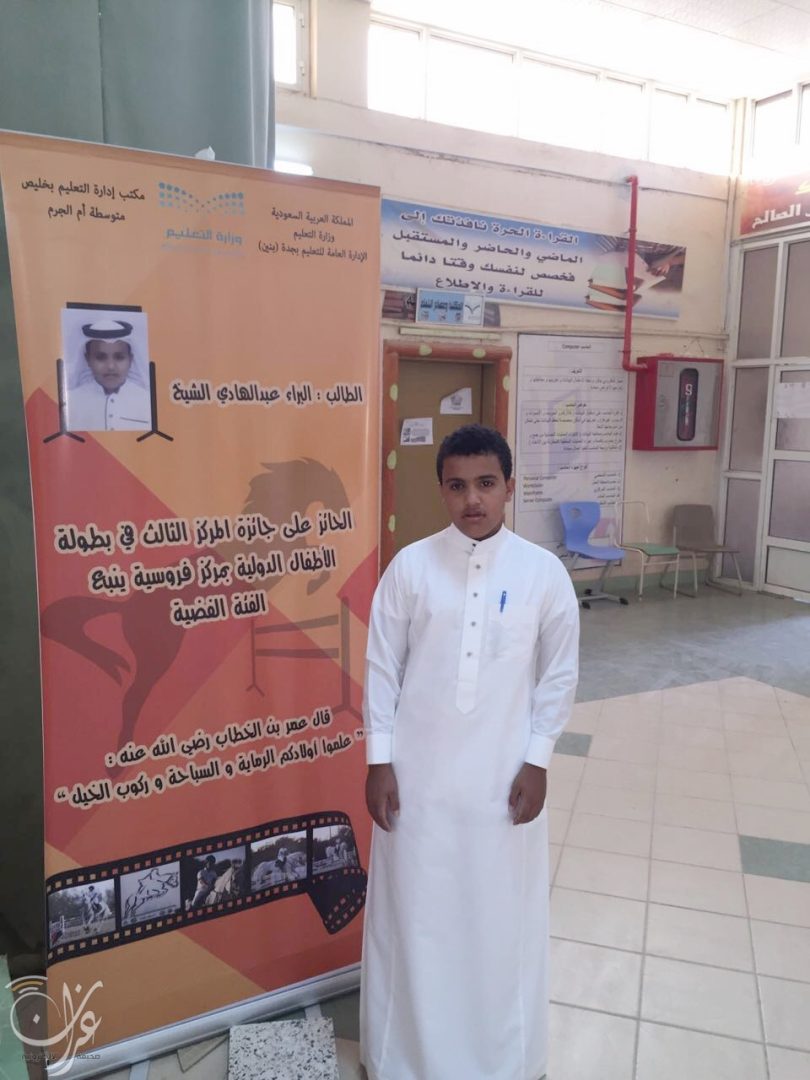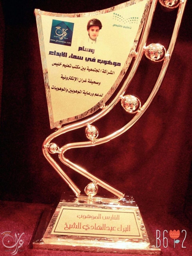 وسام “موهوب في سماء الإبداع” للشراكة المجتمعية بين مكتب تعليم خليص ، و صحيفة غران الإلكترونية لدعم و رعاية الموهوبين و الموهوبات ، إهداء إلى الموهوب “البراء عبدالهادي سلطان الشيخ” .