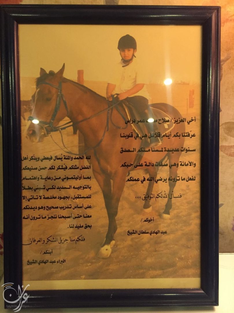 شهادة شكر و تقدير مقدمة من أسرة “البراء الشيخ“ إلى أول مدرب تعلم على يده ركوب الخيل