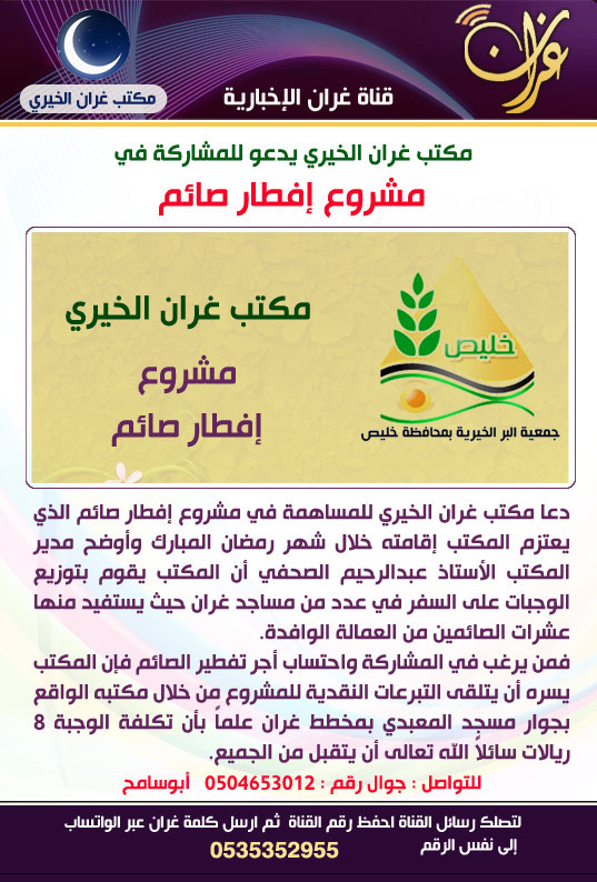 صحيفة غراس الإلكترونية > الأخبار المحلية > مكتب غران الخيري يفتح باب التبرع لمشروع إفطار صائم مكتب غران الخيري يفتح باب التبرع لمشروع إفطار صائم الكاتب: محمد صالح المزروعي 24 يونيو, 2014م 1 20544 دعا مكتب غران الخيري عموم المسلمين والراغبين في الخير واحتساب أجر تفطير الصائم للمساهمة في مشروع إفطار صائم الذي يعتزم المكتب إقامته خلال شهر رمضان المبارك وأوضح مدير المكتب الأستاذ عبدالرحيم بن إبراهيم الصحفي أن المكتب يقوم بتوزيع الوجبات على السفر في عدد من مساجد غران حيث يستفيد منها عشرات الصائمين من العمالة الوافدة وأضاف أن المكتب يتلقى دعماً لهذا المشروع من جمعية البر بمحافظة خليص لتوفير مايقارب ١٢٠٠ وجبة خلال شهر رمضان والمكتب لديه استعداد لتوزيع المزيد من الوجبات لمن يرغب المشاركة في المشروع من خلال تفويض المكتب بشراء الوجبات وتوزيعها، ويسره أن يتلقى التبرعات النقدية للمشروع من خلال مكتبه الواقع بجوار مسجد المعبدي بمخطط غران علماً بأن تكلفة الوجبة 8 ريالات ويعتذر عن قبول التبرعات العينية. سائلاً الله تعالى أن يتقبل من الجميع الصيام والقيام وصالح الأعمال.