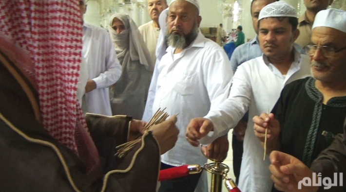 استكمالاً لمنظومة الخدمات التي تقدمها الرئاسة العامة لشؤون المسجد الحرام والمسجد النبوي ، والتي تعود بالنفع والفائدة على قاصدي البيت الحرام وتنفيذاً لتوجيهات معالي الرئيس العام لشؤون المسجد الحرام والمسجد النبوي الشيخ الدكتور عبدالرحمن بن عبدالعزيز السديس وبمتابعة ومعالي نائبه لشؤون المسجد الحرام الدكتور محمد بن ناصر الخزيم قام أعضاء هيئة الأمر بالمعروف والنهي عن المنكر بالمسجد الحرام بتوزيع السواك وتطيب الزائرين طيلة أوقات الصلوات الخمس ويستكمل التوزيع في باقي اليوم والليلة في معرض صفة العمرة
