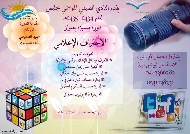 صحيفة غراس الالكترونية > التربية والتعليم > صيفي خليص يقيم دورة في الاحتراف الإعلامي صيفي خليص يقيم دورة في الاحتراف الإعلامي الكاتب: لمياء الصعيدي 01 يوليو, 2014م 0 10147 يقيم النادي الموسمي الصيفي للفتيات بالابتدائية الثانية بخليص دورة بعنوان (الاحتراف الإعلامي) لمدة يومين (الاربعاء والخميس) الموافق ٥ – ٦ رمضان من الساعة (١٠ الى ١٢) مساء. تهدف الدورة إلى التعريف بوسائل الإعلام الرقمي وأهميتها واكساب المتدربة مهارات في إدارة حسابات الفيسبوك وتويتر وأنستغرام وقنوات اليوتيوب بطريقة احترافية. الدورة من تقديم الأستاذتين : عهود ولمياء الصعيدي.وسوف تقام الدورة بمركز الحاسب الآلى بالنادي وستكون الدورة مجانية للمشتركات بالنادي وكذلك . للمشتركات من خارج النادي، علماً بان المقاعد محدودة جداً والأولًوية لمن تسجل أولاً.