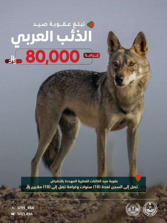 أوضحت القوات الخاصة للأمن البيئي أن عقوبة صيد الذئب العربي تصل إلى غرامة مالية قدرها (80,000) ريال.