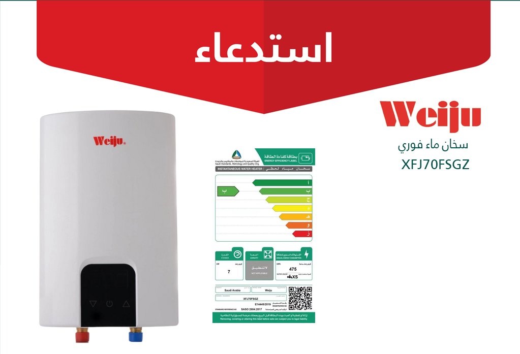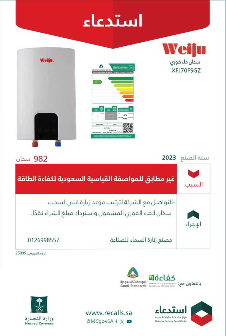 أعلنت وزارة التجارة، اليوم الاثنين، عن استدعاء 982 سخان ماء فوري “Weiju” 2023.