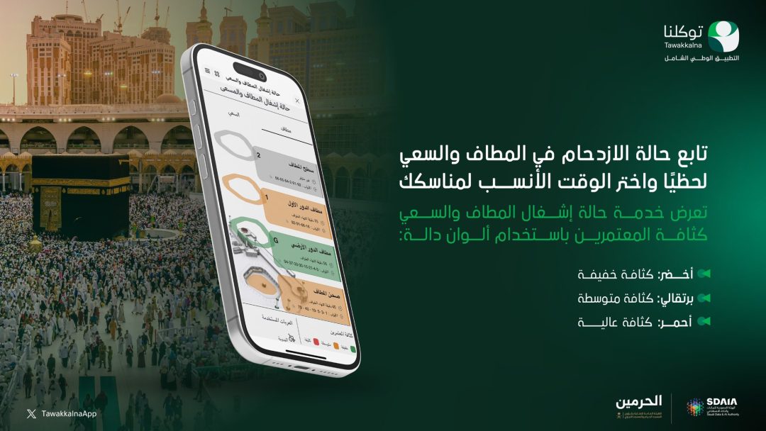 أعلن تطبيق “توكلنا” عن إطلاق خدمة جديدة بالتعاون مع الهيئة العامة للعناية بشؤون المسجد الحرام والمسجد النبوي، تتيح للمستخدمين متابعة حالة إشغال المطاف والسعي بشكل لحظي ومباشر من خلال التطبيق.