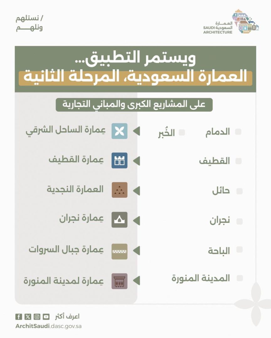 بدأت اليوم المرحلة الثانية من تطبيق الموجهات التصميمية للعمارة السعودية، لتشمل المشاريع الحكومية الكبرى والمباني التجارية في سبع مدن هي: الدمام، الخبر، القطيف، حائل، الباحة، المدينة المنورة، ونجران، بعد تنفيذ المرحلة الأولى في أبها، والطائف، والأحساء.