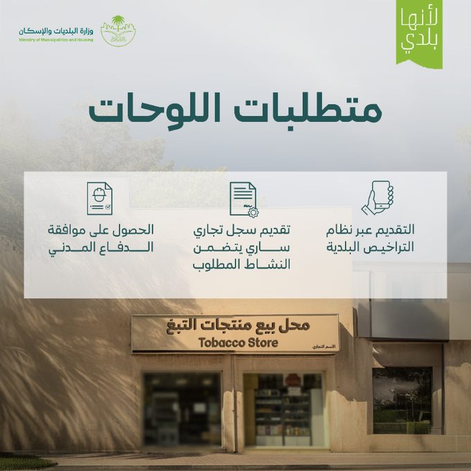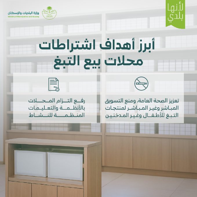 اعتمدت وزارة البلديات والإسكان الاشتراطات التنظيمية لمحال بيع منتجات التبغ، بهدف تعزيز الصحة العامة، وضمان الامتثال للوائح ذات العلاقة، وتهيئة بيئة تجارية نظامية وآمنة في مختلف مدن المملكة.