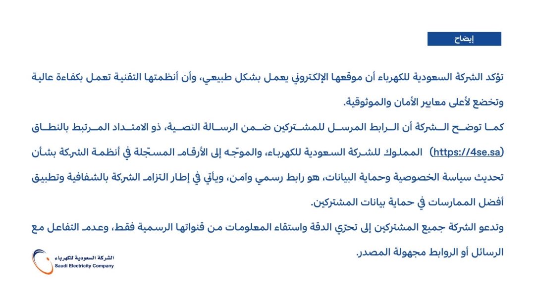 كشفت الشركة السعودية للكهرباء أن الرابط المرسل للمشتركين ضمن الرسالة النصية، ذو الامتداد المرتبط بالنطا: (https://se.sa) المملوك للشركة السعودية للكهرباء، والموجه إلى الأرقام المسجلة في أنظمة الشركة بشأن تحديث سياسة الخصوصية وحماية البيانات هو رابط رسمي وآمن.