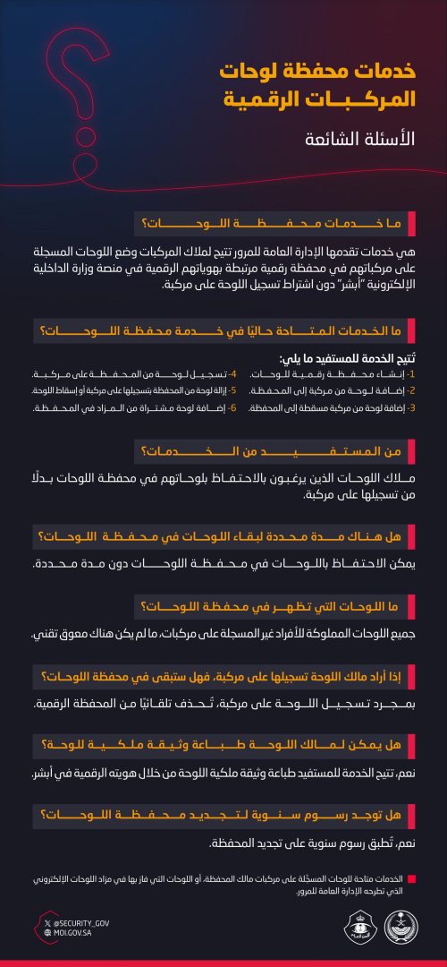 أطلقت منصة «أبشر» التابعة لوزارة الداخلية خدمة محفظة لوحات المركبات الرقمية، التي تمكّن المستفيدين من إدارة لوحاتهم المملوكة بسهولة، ونقلها أو إضافتها إلى المركبات إلكترونيًا عبر المنصة دون الحاجة إلى مراجعة الجهات المختصة.