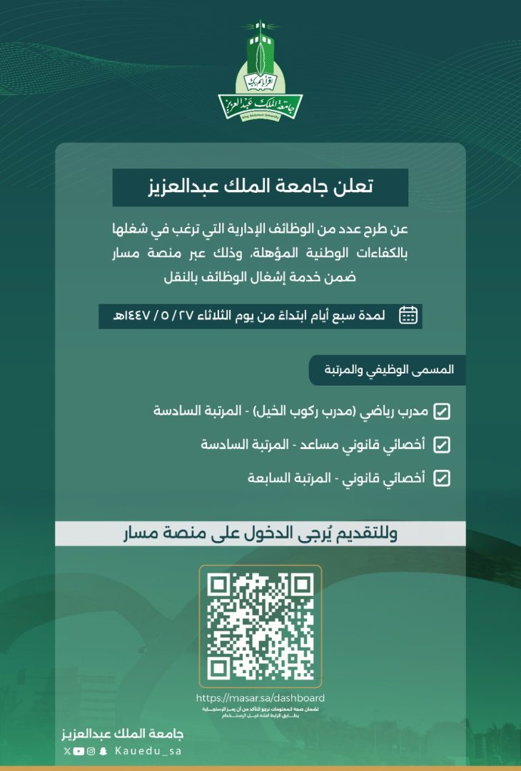 أعلنت جامعة الملك عبدالعزيز عن طرح عدد من الوظائف الإدارية عبر منصة مسار ضمن خدمة إشغال الوظائف بالنقل، وذلك لمدة سبعة أيام على النحو التالي:
