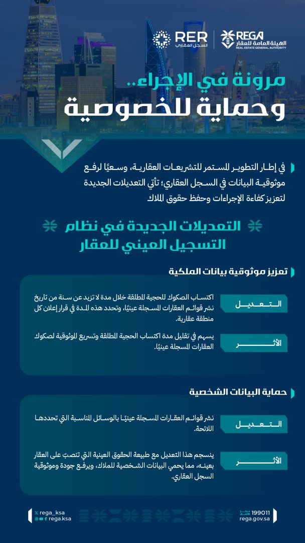 وبينت الهيئة أن التعديلات تضمنت عدم نشر البيانات الشخصية للملاك ضمن القوائم المعلنة، التزامًا بمعايير حماية الخصوصية والبيانات الشخصية، وتماشيًا مع أفضل الممارسات التنظيمية المعمول بها في هذا المجال، مؤكدةً أن تحديث هذه المواد يأتي لتعزيز حوكمة عمليات التسجيل العيني للعقار، ورفع كفاءة السوق العقاري، ودعم جهود التنمية العمرانية والاقتصادية في مختلف مناطق المملكة.