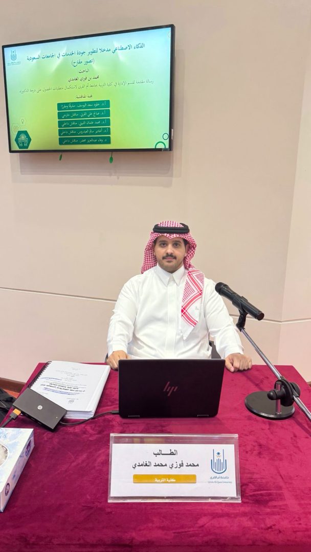 صحيفة غراس الالكترونية > أخبار المجتمع > جامعة أم القرى تمنح الدكتور محمد بن فوزي الغامدي درجة الدكتوراه بمرتبة الشرف الأولى جامعة أم القرى تمنح الدكتور محمد بن فوزي الغامدي درجة الدكتوراه بمرتبة الشرف الأولى الكاتب: صحيفة غراس _ مكة المكرمة 29 يناير 0 798 منحت جامعة أم القرى الباحث الدكتور محمد بن فوزي الغامدي درجة الدكتوراه في الإدارة والتخطيط، بعد مناقشة رسالته العلمية بعنوان: «الذكاء الاصطناعي مدخلاً لتطوير جودة الخدمات في الجامعات السعودية». وأوصت لجنة المناقشة بمنح الباحث الدرجة بتقدير ممتاز مع مرتبة الشرف الأولى، تحت إشراف الأستاذة الدكتورة خلود بنت سعد اليوسف، وبمشاركة كل من الأستاذ الدكتور صالح علي القرني (مناقشًا خارجيًا)، والأستاذ الدكتور محمد عثمان الثبيتي، والأستاذة الدكتورة أغادير سالم العيدروس، والدكتورة وفاء عبدالعزيز محضر (مناقشين داخليين).