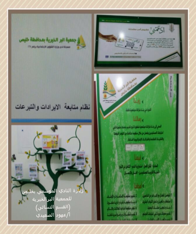 وكذلك القيام بزيارة الى جمعية البر بخليص برفقة الاستاذة عهود الصعيدي للتعريف على الخدمات التي تقدمها الجمعية والاطلاع على مشاريعها لمساعدة المحتاجين ودعمهم واستفاد الطالبات من هذه الزيارة