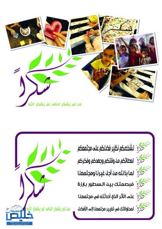 فمن منطلق من لا يشكر الناس لم يشكر الله بدأ برنامج شكرا هذا الاسبوع بالنادي الصيفي بخليص بإشراف الاستاذة عواطف الصبحي ويهدف الى تأصيل معنى الشكر والاعتراف بفضل صانع المعروف في مجتمعنا وذلك بتقديم الشكر للأفراد الفاعلين والجهات الحكومية والخاصة والذين يبذلون جهودا ويقدمون خدمات للمجتمع على حساب وقتهم وجهدهم فأقل ما نقدمه لهم على هذا العطاء هو الشكر والاعتراف بجميل صنيعهم وما بذلوه من خدمة للرقي بالمجتمع