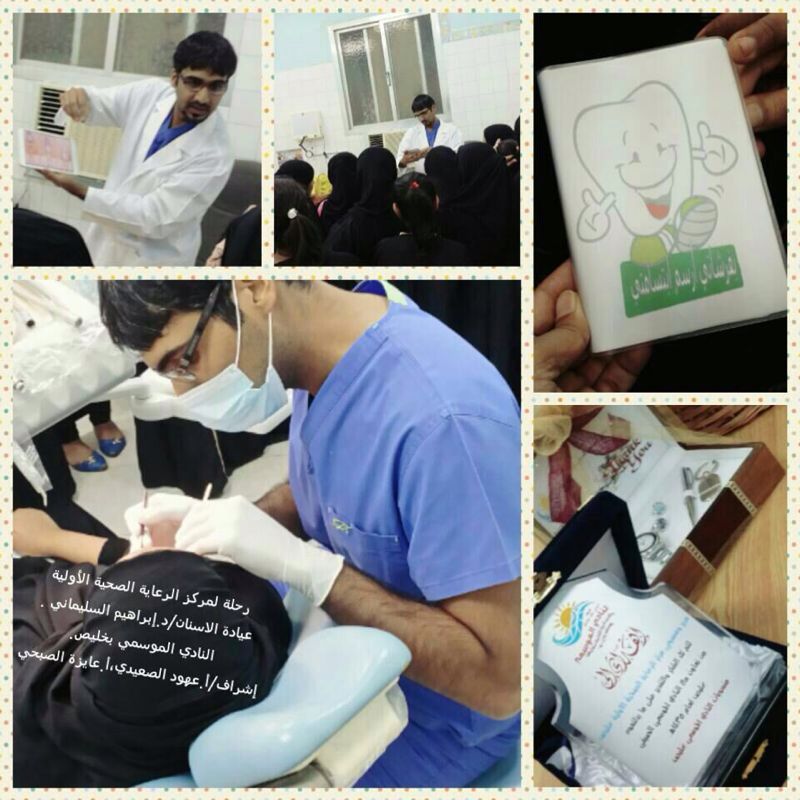 القيام بزيارة المركز الرعاية الصحية الاولية بخليص برفقة المشرفتين عهود الصعيدي ًعايزه الصبحي وحضور برنامج العناية بالأسنان مع الدكتور ابراهيم السليماني واستفاد الطالبات من هذا البرنامج وتم شكر منسوبي المركز على تعاونهم مع النادي وتقديم درع وهدية