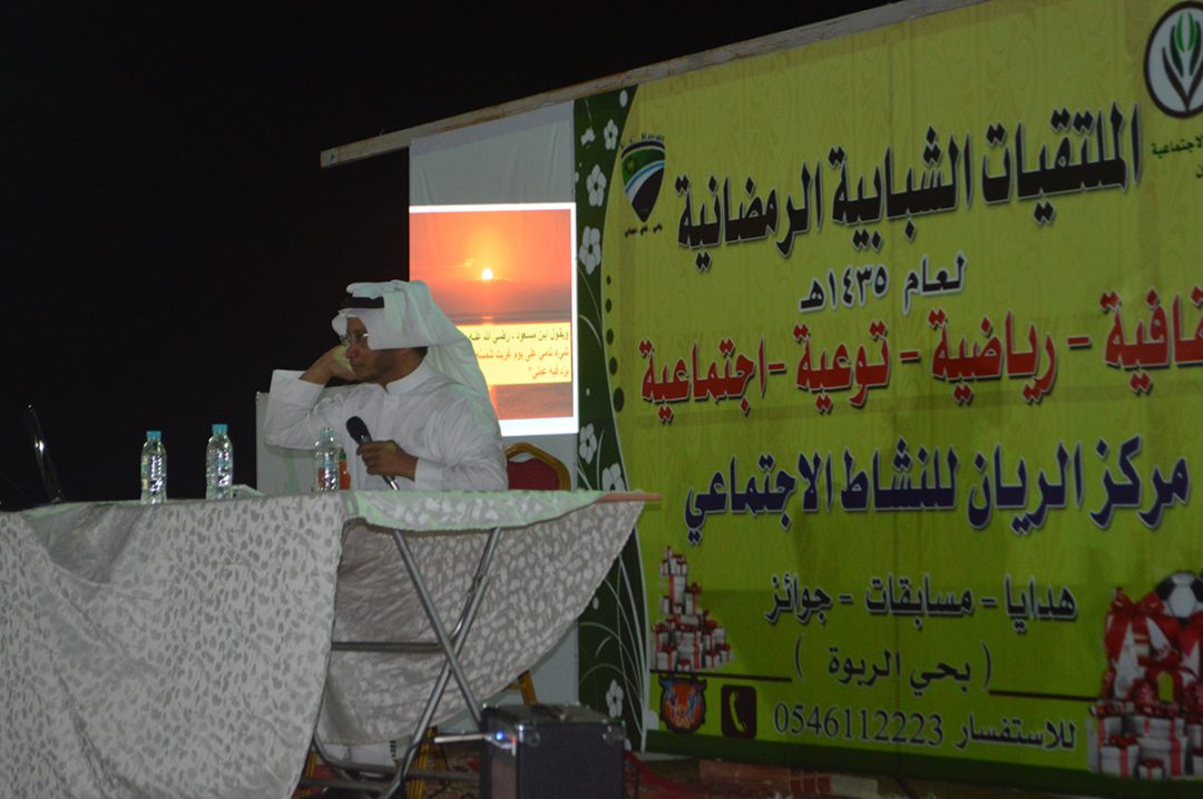 اختتم مساء أمس مركز الريان للنشاط الاجتماعي بحي الربوة ملتقاه الرمضاني لعام 1435 هـ بدورة في إدارة الوقت للمدرب محمد سعيد الصحفي ، حيث قدم الاستاذ عبدالله فيصل الصحفي المدرب ورحب بالحضور الذين كان في مقدمتهم عمدة خليص الاستاذ عبدالعزيز رحيم الصحفي والاستاذ عبد العزيز عثمان الصحفي رئيس لجنة التنمية الاجتماعية بغران.