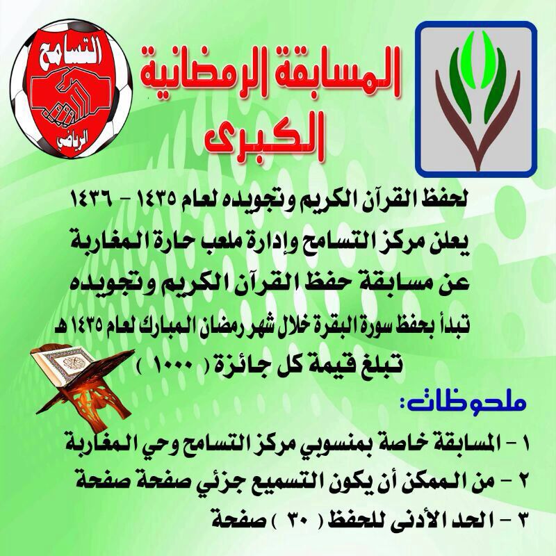 ضمن سلسلة أنشطه مركزالتسامح بخليص ، أعلن المركز عن مسابقته الرمضانية الأولى في حفظ القرآن تجويده وفتح باب التسجيل للراغبين حتى نهايه شهر رمضان المبارك وهي عبارة عن حفظ سوره البقرة أو جزء منها وتستهدف المسابقة فئة الشباب من الجنسين الذكور والاناث وتركز المسابقه على الشباب غير المنتسبين لحلقات التحفيظ بهدف تعويدهم على الحفظ وترغيبهم فيه.