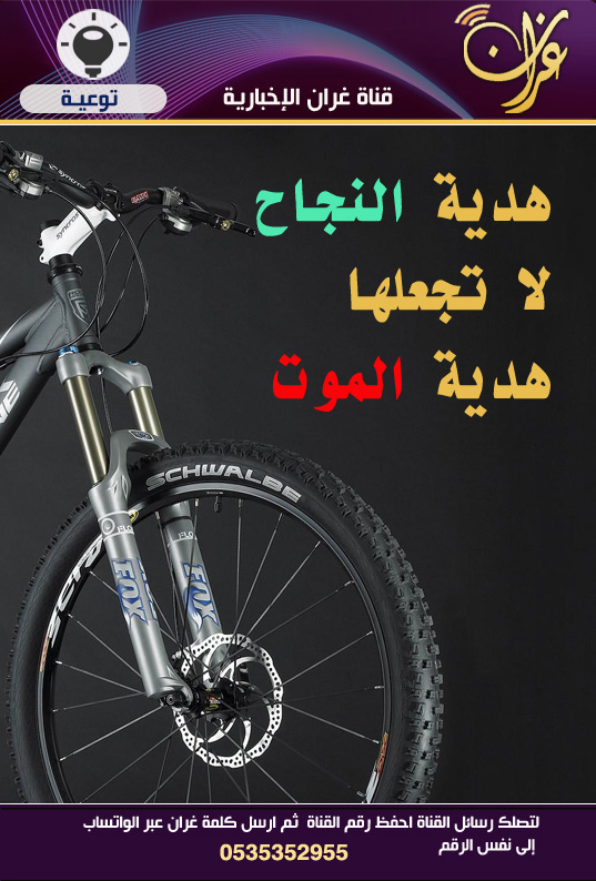 وقد سبق أن حذرت قناة غران الإخبارية مع بداية الاجازة المدرسية أولياء الأمور من شراء الدراجات (النارية والهوائية) لأطفالهم كنوع من هدايا النجاح ونشرت بوسترات تحت عنوان : هدية النجاح لا تجعلها هدية الموت !