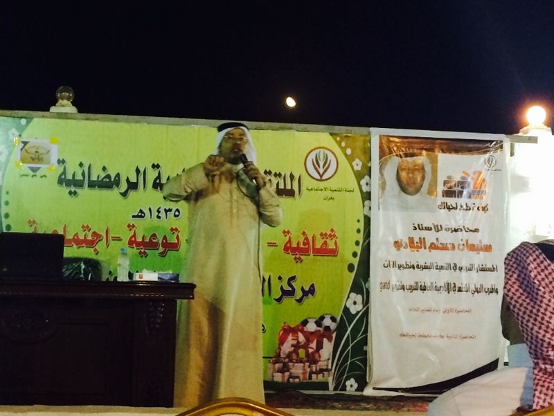 بدأ الحفل بآيات من كتاب الله الكريم ثم كلمة للأهالي ألقاها الاستاذ محمد سعيد الصحفي ثم بعد ذلك ألقى المدرب المحترف الأستاذ سليمان البلادي دورته التدريبية التي كانت بعنوان (كيف تنظم وقتك)